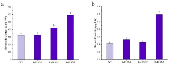 To analyze the effect of overexpression of the RuFLS2 gene on flavonoid-related metabolites, the contents of flavonoids and total phenolics in the leaves of the transgenic FLS and WT lines were determined. The results showed that the flavonoid content of one transgenic tobacco line was the same as that of the WT, and the content of the other two lines increased by 1.3- and 1.8-fold (Figure 6a). The content of total phenol was similar to that of flavonoids, where one line had the same content as the WT, and the other two lines showed increases of 1.25- and 2.84-fold (Figure 6b). Overall, the overexpression of the RuFLS2 gene increased the contents of flavonoids and phenols in tobacco, indicating that the overexpression of RuFLS2 increased the contents of flavonoid-related substances in plants. As there are many kinds of flavonoids in plants, a metabolome analysis needs to be performed in the future.