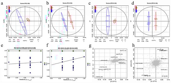 PLS-DA and OPLS-DA of WT and RuFLS2-OX tobacco. PLS-DA analysis of WT and RuFLS2-OX tobacco with positive (a) and negative (b) patterns. OPLS-DA of WT and RuFLS2-OX tobacco with positive (c) and negative (d) patterns. The OPLS-DA displacement test of WT and RuFLS2-OX tobacco with positive (e) and negative (f) patterns. Loading plot diagram of WT and RuFLS2-OX tobacco with positive (g) and negative (h) patterns.