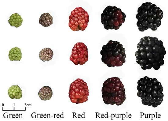Appearance of blackberry cv. ‘Chester’ fruits at various developmental stages. According to the color of the fruit, the development of the fruit can be divided into five stages: green fruits, green–red fruits, red fruits, red–purple fruits, and purple fruits.