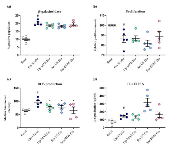 - Dimri, G.P.; Lee, X.; Basile, G.; Acosta, M.; Scott, G.; Roskelley, C.; Medrano, E.E.; Linskens, M.; Rubelj, I.; Pereira Smith, O. A biomarker that identifies senescent human cells in culture and in aging skin in vivo. Proc. Natl. Acad. Sci. USA 1995, 92, 9363–9367. [Google Scholar] [CrossRef]