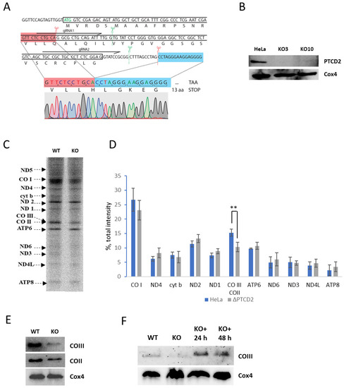 The focus of our research is PTCD2, a mysterious protein whose function was unknown despite the available data. Its mitochondrial localization and PPR family membership suggested its possible biological role in regulation of mitochondrial gene expression. A PTCD2 knock-out mouse model was studied previously. It demonstrated the reduction in activity of complex III in the heart, an increase in activity of complex IV in heart, muscle and liver along with defects in apocytochrome b mRNA maturation [9]. However, the published model was not a true knock-out because truncated protein was still synthesized, and only exons 9 and 10 were missing. We made disruption of PTCD2 gene in human HeLa cells by introducing a frame-shift mutation close to the start codon and analyzed their mitochondrial translation, oxygen consumption, OXPHOS complex activity, and supercomplex formation. We show that PTCD2 deletion selectively decreased translation of COIII mRNA and the activity of the respiratory chain complex IV (CIV). As a consequence, it affects respiration and supercomplex formation. In addition, we obtained the data from sedimentation analysis and pull-down proteomics which allow us to suggest the interaction of PTCD2 with mitochondrial ribosomes.