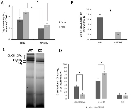 2.2. The Absence of PTCD2 Affects Mitochondrial Respiration, Complex IV Activity, and Supercomplex Formation