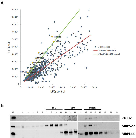 PTCD2 interacts with associated mitochondrial ribosomes. (A) Proteomic data analysis. The diagram represents the protein species identified in the samples of coIP and negative control. Label free quantification (LFQ) intensities for all proteins were calculated with Max Quant software. LFQs of the proteins in coIP samples are placed along the vertical axis; LFQs of the same proteins in negative control samples are placed along the horizontal axis. Blue dots show each individual protein. Yellow dots indicate mitochondrial ribosomal proteins. Red line shows the position of the points where proteins are equally represented in coIP and negative control. Green line is a threshold line showing the positions of the points where proteins are 1.8 times enriched in coIP relative to control. (B) Western blot analysis of fractionated mitochondrial ribosomes. Clarified HeLa cell lysate was applied to 10–30% linear sucrose gradient and ultracentrifuged. The gradient was fractionated from top to bottom in 21 fractions and proteins from each fraction were precipitated and applied to Western blot with the indicated antibodies. LC—loading control (0.1% from total lysate volume), SSU—mitoribosome small subunit, LSU—mitoribosome large subunit, mitoR—associated mitoribosome.