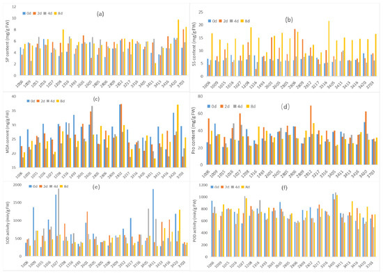 The Pro content in leaves of genotypes 1009, 1208, 2601, 2806, and 3411 decreased to a value lower than that in the control after low-temperature treatment at different timepoints. However, that in genotypes 1005, 1006,1016, 1316, 2605, 2805, 3217, 3316, 3405, and 3420 ended up lower than that in the control on the eighth day after undergoing an increase or decrease on the second or fourth day of treatment. The opposite trend was shown for genotypes 1493, 2809, and 3703, whose Pro content increased significantly, finishing higher than that in the control on the eighth day of low-temperature stress. The Pro content in genotypes 1027, 2812, 3413, and 3416 always exceeded than that in control. It is worth noting that the Pro content in genotypes 1006, 1027, 2812, and 3420 increased sharply on the second day, and then decreased significantly, albeit remaining higher that in the control except for genotype 3420 on the eighth day of treatment (Figure 1d).