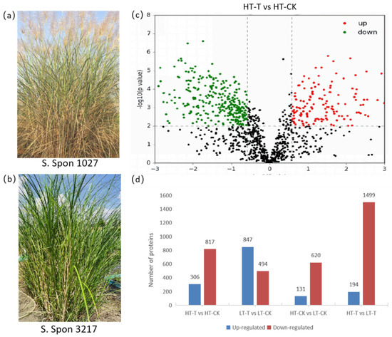 Phenotypes of two S. spontaneum genotypes for proteomics analysis and differentially abundant proteins from all comparison groups. (a) Phenotype of S. spontaneum 1027 with high tolerance to cold. (b) Phenotype of S. spontaneum 3217 with low tolerance to cold. (c) Volcano map of differentially abundant proteins from HT-T vs. HT-CK comparison. Red dots indicate upregulated (multiple of variation > 1.2, p < 0.05) proteins, green dots indicate downregulated (multiple of variation < 0.833, p < 0.05) proteins, and black dots indicate non-differentially expressed proteins. (d) Comparison of DAPs based on genotypes and treatments. Change ratio = 1.5 and p = 0.01 were selected as the differential protein threshold.