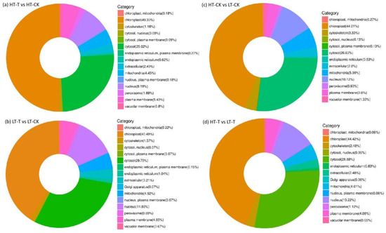 To clarify the response of different genotypes to low temperature, we performed a statistical analysis on the DAPs from the four comparison groups. According to subcellular localization analysis, the DAPs in all comparisons were mainly localized in the chloroplasts (> 40%), followed by cytosol (> 25%), cell nucleus (> 8%), and mitochondria (about 5%). However, the percentage of each category differed across comparisons (Figure 3).