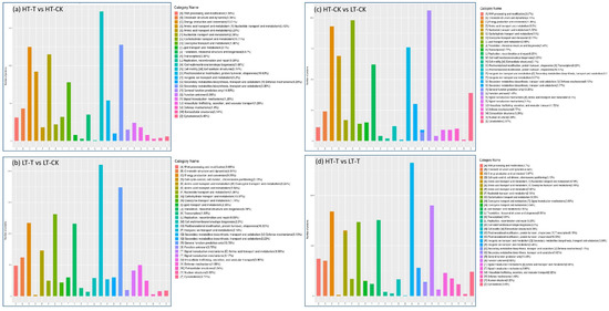 Further COG analysis on the DAPs from the four comparisons showed that the DAPs from all four groups were divided into 24 categories. The six COG categories O, R, C, G, E, and J were the largest, mainly related to post-translational modification, protein conversion, and molecular chaperones (O), general function prediction (R), energy production and conversion (C), carbohydrate transport and metabolism (G), amino acid transport and metabolism (E), and translation, ribosome structure, and biogenesis (J). Among them, categories O and R accounted for the highest proportions in the HT-T vs. HT-CK (Figure 4a; Table S6), LT-T vs. LT-CK (Figure 4b; Table S7), and HT-T vs. LT-T (Figure 4d; Table S8) comparison groups, while the higher proportions were recorded for categories R and G in the HT-CK vs. HT-CK comparison group (Figure 4c; Table S9). The percentage of each category differed across comparison groups. These results confirmed the distinct mechanisms via which different genotypes respond to low temperature.
