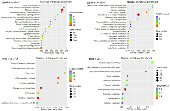 The DAPs from high-tolerance genotype S. spontaneum 1027 between treatment and control (HT-T vs. HT-CK) were highly enriched in the biosynthesis of secondary metabolites, ascorbate and aldarate metabolism, peroxisome, amino sugar and nucleotide sugar metabolism, photosynthesis, tryptophan metabolism, etc. (Figure 5a; Table S10). DAPs from low-tolerance genotype S. spontaneum 3217 before and after treatment (LT-T vs. LT-CK) were highly enriched in cytochrome P450-mediated metabolism of xenobiotics, glutathione metabolism, RNA transport, phenylpropanoid biosynthesis, pyrimidine metabolism, etc. (Figure 5b; Table S11). The results indicate that DAPs from the two genotypes with contrasting cold tolerance participated in distinct pathways, which may be the main reason for the tolerance difference between genotypes.