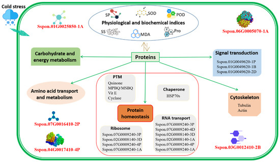 A putative regulatory network of S. spontaneum response to low temperature. Cold stress induces the variation of physiological and biochemical indices, as well as the abundance change in related proteins to coordinate a response. The proteins involved in cold stress response include those in pathways related to protein homeostasis, carbohydrate and energy metabolism, amino acid transport and metabolism, signal transduction, and the cytoskeleton. Five proteins identified for the first time in sugarcane are illustrated in red bold font. PTM, post-translational modification. SP, soluble protein. SS, soluble sugar. MDA, malondialdehyde. SOD, superoxide dismutase. POD, peroxidase.