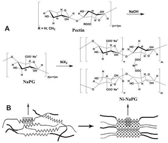 Schemes for the synthesis of pectin polysaccharide complexes (n = 3–10; m = 10–35) with nickel (A) and the formation of polymer-complex structures according to the “egg-box” [28] model (B—right).