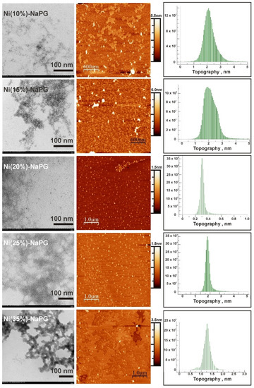 For a number of Ni(n%)-NaPG samples with varying degrees of nickel substitution (from 5% to 35%), the film structures formed during their deposition from the liquid phase onto the solid surface have been studied. Figure 2 shows TEM images (left column), AFM images (central column), and particle size distribution (right column) from the AFM images for the Ni(n%)-NaPG compounds indicated in the left column. TEM images demonstrate the formation of an organic film with the introduction of metal particles with a small size spread (a few nanometers). A high uniformity of the distribution of the array of metal particles in the volume of the organic matrix is observed. Upon that, it is possible to indicate the presence of self-organization and structuring of the system due to intermolecular interaction. It can be assumed that a certain cellular structure is formed, leading to a uniform redistribution of metal centers. A simplified model of this structure has been reported before [20].
