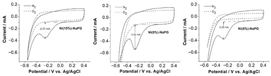 CV indicating amplitudes of cathodic peaks for the ORR on GC electrodes of Ni (15%)-NaPG (left), Ni(20%)-NaPG (center), and Ni(25%)-NaPG (right) coordination biopolymers in a nitrogen-protected environment (dashed curves) or oxygenated 0.5 M H2SO4 (solid curves) at a scan rate of 50 mV s−1; GC electrode area: 0.0707 cm2.