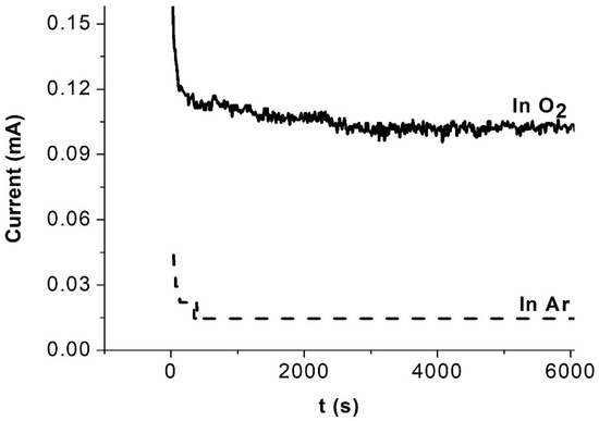Potentiostatic stability tests of the Ni (20%)-NaPG/C catalyst on a CC electrode (S = 0.0707 cm2) in 0.5 M H2SO4 for 6000 s in both oxygen (solid, thick curve) and argon (dashed curve) saturated solutions at the same applied potential (E = −0.15 V vs. Ag/AgCl) with 0.05 mg of the catalyst.