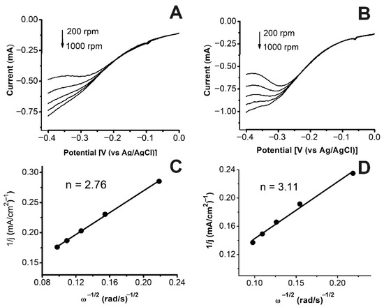 where B = 0.62FD2/ υ−1/6c, i—current on the disk electrode; iK—kinetic current; iD—diffusion current; ω—disc electrode rotation speed (rad/s); n—the number of electrons involved in the electrochemical reaction; F—Faraday constant, C/mol; D—diffusion coefficient, cm2/s; υ—kinematic viscosity of electrolyte, cm2/s; c—oxygen concentration in solution, mol/cm3. The parameters given in Table 4 are suitable for our system. The reverse current for the Koutecky–Levich plot has been in all cases measured at the indicated potentials vs. Ag/AgCl.