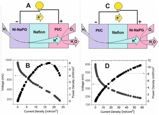 Representations (A,C) of the H2/O2 PEMFC and polarization and power curves at 80 °C for MEAs Ni(20%)-NaPG/Nf/Pt (B) and Pt/Nf/Ni(20%)-NaPG (D).