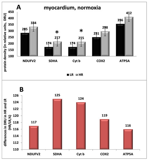 (A). The content of the catalytic subunits of mitochondrial complex enzymes MC I–V in the myocardium of HR and LR rats under normoxic conditions (protein density in relative units, DRU): NDUFV2-MC I; SDHA-MC II; Cyt b-MC III; COX2-MC IV; ATP5A-MC V. (B). The difference in protein content in the measured subunits in the myocardium of HR and LR rats (HRDRU/LRDRU, %). (*) the differences between the groups are significant, p < 0.05.