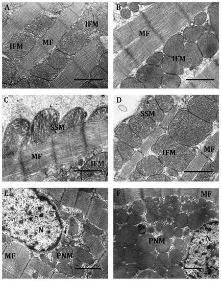 The main portion of mitochondria in cardiomyocytes are the IFM. They are localized in rows between myofibrils and have lamellar cristae involved in the production of ATP for cardiomyocyte contraction and Ca2+ signaling. SSM are located under the sarcolemma as separate organelles or small clusters. They feature lamellar cristae used to generate energy for ion channels and transfer intercellular signaling [20,21]. PNM are normally clustered at the poles of the nucleus, are in close contact with the endoplasmic reticulum and are, apparently, involved in transcriptional regulation [20,22]. There are no literature data on the ultrastructural features of mitochondria from HR and LR rat cardiomyocytes.