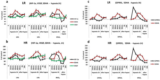 Dynamics of the expression of HIF1-α, VEGF, SDHA (a,b), GPR91 and SDHA (c,d) in LR and HR rat myocardium during a single 1-h hypoxic exposure (HBH, FiO2—14, 10, 8% O2) and in the post-hypoxic period (For the rest, see Figure 2).