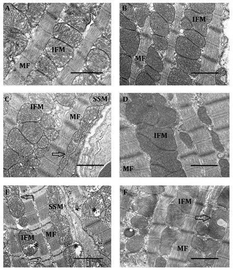 - Geng, Y.; Hu, Y.; Wang, H.; Shi, S.; Shi, J.; Qiu, Z. Deficiency of interfibrillar mitochondria in post-acute myocardial infarction heart failure. Pak. J. Pharm. Sci. 2017, 30, 1089–1094. [Google Scholar] [PubMed]