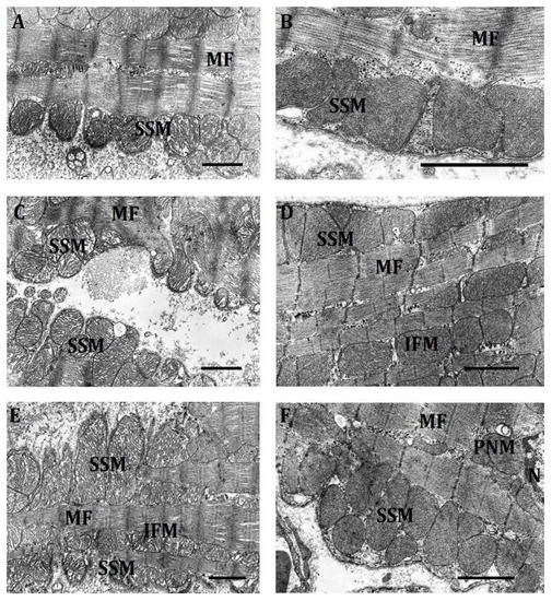 The ultrastructure of a part of a cardiomyocyte in rats with low (A,C,E) and high (B,D,F) resistance to oxygen deficit under normoxic conditions. Representative electron microscopy images showing intermyofibrillar (A,B), subsarcolemmal (C,D) and perinuclear (E,F) mitochondria; IFM, SSM and PNM are interfibrillar, subsarcolemmal and perinuclear mitochondria, respectively; MF, myofibrils; N, nucleus. Scale bar, 0.5 μm.