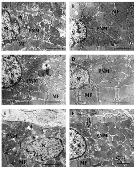 Under normoxic conditions, the PNM population comprised the largest number of small mitochondria that in HR rats were 55% and in LR animals, 35% of the total number of mitochondria, which sharply distinguished them from IFM and SSM (Table 1). Herewith, PNM of HR rats were 1.7 times larger than those of LR animals, and their number was 1.6 times greater. Accordingly, the perinuclear region normally localized at the poles of the nucleus was also much larger in HR rats (Figure 2F). In the latter, most PNM contained in it were of a round shape, had a dense matrix and regularly organized cristae characteristic of this type of organelles, were more motile and not fixed by myofibrils. Still, irregular-shape fused mitochondria also occurred (Figure 2E,F). Most PNM in HR rats communicate with one another, forming contacts of the type of “kissing junctions” between adjacent mitochondria [23] and thus creating clusters.