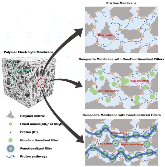 Schematic illustration of ion-conducting channel formation of a pristine membrane, a composite membrane with non-functionalized filler, and a composite membrane with functionalized filler, respectively.
