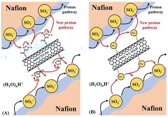 Schematic of the tortuous pathways of protons through (A) Nafion/MWCNT-Im and (B) Nafion/MWCNT-SO3H composite membranes. Adapted with permission from [77]. Copyright 2018, John Wiley and Sons.