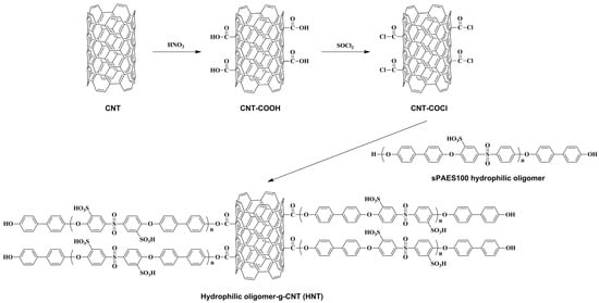 The major problems with hydrocarbon-based PEMs in PEMFC applications are the rapid drop of proton conductivity under low RH conditions (≤50% RH) and the deterioration of physicochemical properties (e.g., mechanical strength, swelling ratio, and oxidative stability) as the degree of sulfonation is increase. In order to improve these PEM properties, many studies have been conducted on the incorporation of functionalized carbon-based fillers into the hydrocarbon-based polymers. Representatively, In Hyouk Sung et al. reported the effect of a hydrophilic oligomer grafted CNT on sulfonated hydrocarbon-based composite membrane used in a PEMFC system [78]. A hydrophilic oligomer, sulfonated poly(arylene ether sulfone) with DS of 100 mol% (SPAES100), was synthesized by condensation polymerization using sulfonated dihalo monomer and biphenol. Then, SPAES100 was grafted on CNT by nucleophilic substitution to prepare hydrophilic oligomer-graft-CNT (HNT) (Figure 6). SPAES with DS of 50 mol% (SPAES50) was prepared as the hydrocarbon-based polymer matrix in the composite membrane system, and the HNT impregnated composite membrane (SPAES/HNT) was prepared by general solvent casting method via dispersing the optimal weight content of HNT in the SPAES50 solution. Since the SPAES100 oligomer in HNT has a similar structure with the polymer matrix (SPAES50), the compatibility issues inducing decrements in PEM properties were not found in SPAES/HNT membrane compared to the SPAES/CNT membrane. Furthermore, the low proton conductivity of general hydrocarbon-based PEMs at high temperature and low RH condition is improved considerably by the addition of HNT. The proton conductivity value of the SPAES/HNT membrane was about 38% larger than that of the pure SPAES50 membrane at 80 °C and 50% RH by forming additional ion conducting channels between HNT and SPAES50. The increased water uptake of the SPAES/HNT membrane also supported better formation of ionic clusters compared to the pure SPAES50 membrane. These results demonstrated that preparation of functional fillers having a similar structure to the polymer matrix can effectively increase the dispersity and thus enhance PEM properties.