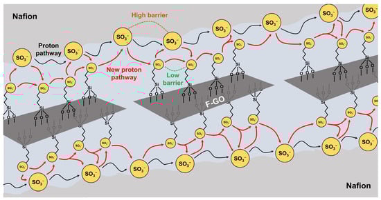 Hadis Zarin et al. prepared functionalized GO (F-GO) via grafting 3-mercaptopropyl trimethoxysilane (MPTMS) on GO surfaces followed by sulfonation using 30 wt.% hydrogen peroxide solution. (Figure 8). Then, F-GO was impregnated into Nafion at different weight ratios to fabricate a series of Nafion/F-GO composite membranes [84]. The water uptake of the Nafion/F-GO composite membranes was 6.0% higher than that of recast Nafion due to the increase in the hydrophilic properties as the F-GO content increased. The proton conductivity of the Nafion/F-GO composite membranes was also larger than that of recast Nafion. In particular, due to the formation of additional proton conducting channels by the addition of F-GO, the proton conductivity of the composite membrane (8.0 mS cm−1) exhibits 4-fold higher than that of recast Nafion (2.0 mS cm−1) at 80 °C and 20% RH. Since F-GO with grafted sulfonic acid groups were well-dispersed in Nafion, the Nafion/F-GO membrane showed better overall PEM properties including physical stability, mechanical strength and proton conductivity, compared to the recast Nafion.
