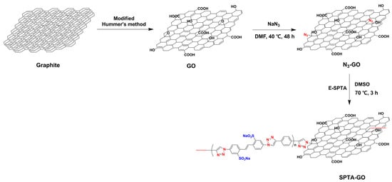 Preparation of sulfonated polytriazole graphene oxide (SPTA-GO). Adapted with permission from [104]. Copyright 2020, Elsevier.