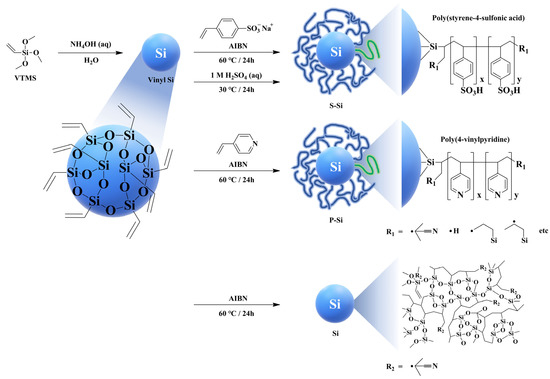 Taeyun Ko et al. synthesized vinyl silica (vinyl Si) from vinyltrimethoxysilane through a hydrolysis reaction and then radical polymerization was conducted using each of 4-styrensulfonic acid sodium salt hydrate (SSANa) and 4-vinylpyridine (4VP) to prepare two different types of core–shell silica particles with poly(4-styrenesulfonic acid) (PSSA) and poly(4-vinylpyridine) (P4VP) in the shell layer, respectively. The acidic PSSA and basic P4VP grafted core–shell silica particles were named S-Si and P-Si, respectively (Figure 13) [126]. Following this, the SPAES based composite membranes with 5 wt.% of S-Si and P-Si were fabricated to investigate the effect of these functionalized fillers on PEM properties. As observed in most organic/inorganic composite membranes, the mechanical strength of the SPAES/S-Si and SPAES/P-Si composite membranes were greater than that of the pure SPAES membrane. Of note, the mechanical strength of the P-Si filler was demonstratively better than that of the S-Si filler due to the presence of ionic cross-linking between the basic P4VP in the shell layer of P-Si and the acidic sulfonic acid groups of the SPAES matrix [129]. Although the water uptake of the SPAES/S-Si and SPAES/P-Si composite membranes were lower than that of pure SPAES membrane, the proton conductivity of both composite membranes was larger than that of the SPAES membrane for two different reasons. For the SPAES/S-Si membrane, the enhanced proton conductivity could be ascribed to the increased sulfonic acid content, resulting in additional proton conducting channels with the sulfonic acid groups in the SPAES matrix. The increased IEC value calculated by acid-base titration method and change of hydrophilic domain size measured by small-angle x-ray scattering (SAXS), supported the enhanced proton conductivity of the SPAES/S-Si composite membrane. In contrast, the SPAES/P-Si membrane showed 2-fold better proton conductivity than the SPAES membrane (1.1 mS cm−1) at 80 °C and 40% RH due to the formation of additional proton hopping channels by the acid-based interactions between the pyridine groups in P-Si and the sulfonic acid groups in the SPAES matrix, resulting in the formation of protonation-deprotonation loops [109,130,131]. The calculation of activation energy of proton transport by Arrhenius plots, and comparison of SAXS data of SPAES/P-Si and pure SPAES membranes, also supported the enhanced proton conductivity of the SPAES/P-Si membrane.
