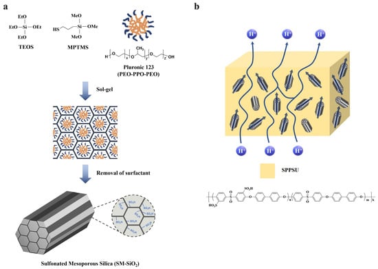 Schematic representations of (a) SM-SiO2 and (b) SPPSU composite membrane, wherein the conceptual proton transport pathway of the SPPSU composite membrane is also illustrated. Adapted with permission from [132]. Copyright 2012, Elsevier.