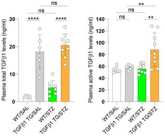 Increased circulating levels of total and active TGFβ1 in TGFβ1 TG mice with diabetes mellitus. The plasma levels of total and active TGFβ1 were measured by immunoassay using a commercial kit. The number of mice were as follows: WT/SAL n = 6, TGFβ1 TG/SAL n = 6, WT/STZ n = 8, TGFβ1 TG/STZ n = 9. Data are expressed as mean ± S.D. Statistical analysis by one-way analysis of variance (ANOVA) with Newman–Keuls’ test. ** p < 0.01; **** p < 0.0001; ns, not significant.
