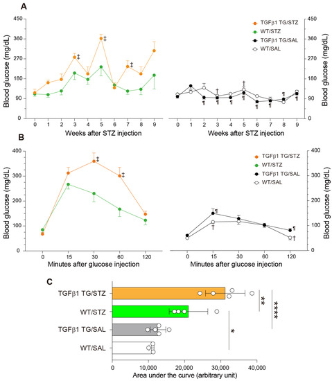 The intraperitoneal glucose tolerance test revealed a significant increase in the blood glucose levels of the diabetic TGFβ1 TG mice after 30 and 60 min of glucose injection compared to their counterpart diabetic WT mice and after 15 and 120 min of glucose injection compared to the non-diabetic TGFβ1 TG mice. In addition, the blood glucose levels were significantly increased in the diabetic WT mice after 15 and 120 min of glucose injection compared to the non-diabetic WT mice (Figure 2B). The blood glucose levels were similar at the starting point of the intraperitoneal glucose tolerance test. Similar levels of blood glucose at the starting point of the intraperitoneal glucose tolerance test in the STZ model have also been reported [27,28,29,30,31,32]. Our calculation of the area under the curve also disclosed a significant difference in the blood glucose levels between the mice treated with streptozotocin (STZ), the TGFβ1 TG/STZ and WT/STZ mice, and the TGFβ1 TG/STZ and TGFβ1 TG/SAL (saline) mice, and between the WT/STZ and WT/SAL mice (Figure 2C).