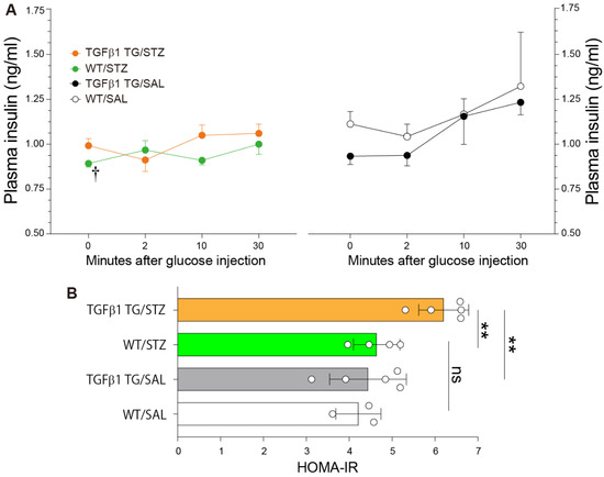 Reduced plasma insulin levels after glucose injection and insulin resistance in diabetic TGFβ1 TG mice. (A) The glucose-stimulated insulin secretion test was performed after 16 h of fasting by the intraperitoneal injection of glucose. Insulin was measured using blood samples taken after 0, 2, 10, and 30 min of glucose injection. (B) Homeostasis model assessment for insulin resistance (HOMA-IR) was determined before glucose administration, as described in the Materials and Methods. Number of mice: n = 3 in WT/SAL, n = 5 in TGFβ1 TG/SAL, n = 4 in WT/STZ, n = 5 in TGFβ1 TG/STZ. Data are the mean ± S.D. Statistical analysis by Kruskal–Wallis ANOVA with Dunn’s test. † p < 0.05 vs. WT/SAL; ** p < 0.01; ns, not significant.