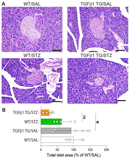 The pancreas was resected and stained with hematoxylin and eosin to measure the islet areas using the WinROOF image software. The area of the islets was significantly reduced in the TGFβ1 TG/STZ mice compared to the TGFβ1 TG/SAL mice. However, no significant difference was observed between the TGFβ1 TG/STZ and WT/STZ mice (Figure 4A,B).
