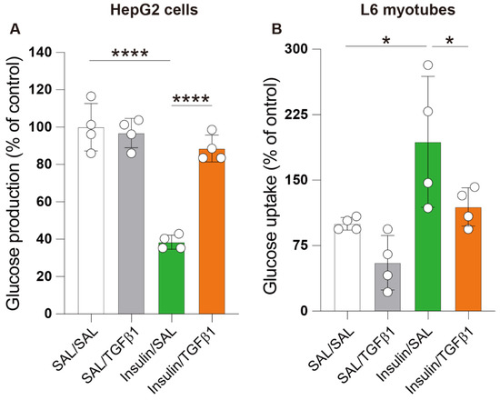 Under insulin resistance conditions, the insulin-mediated suppression of glucose production by the hepatocytes and uptake of glucose by the skeletal muscles is impaired. In the present study, we used HepG2 cells and L6 myotubes to evaluate whether TGFβ1 induces insulin resistance in vitro [33]. HepG2 cells and L6 myotubes were cultured in the presence of insulin, and the effect of TGFβ1 on the glucose levels in the cell supernatants was evaluated. The presence of TGF-β1 markedly reversed the reduction in glucose release by the HepG2 cells with insulin (Figure 5A). On the other hand, the significantly increased glucose uptake induced by insulin in the L6 cells was significantly inhibited by TGFβ1 (Figure 5B).