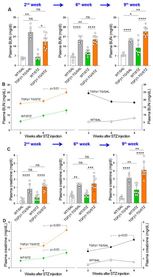 The plasma concentrations of creatinine were significantly increased in the diabetic TGFβ1 TG mice at weeks 2, 6, and 9 after STZ injection compared to their diabetic WT counterparts. The plasma creatinine levels were not significantly different between the diabetic and non-diabetic TGFβ1 TG mice at weeks 2 and 6 after STZ injection but significantly increased in the diabetic TGFβ1 TG mice compared to the non-diabetic TGFβ1 TG mice at week 9 after the induction of DM with STZ. The non-diabetic TGFβ1 TG mice showed significantly elevated plasma levels of creatinine at weeks 2, 6, and 9 after STZ injection compared to the non-diabetic WT counterparts. The plasma creatinine levels were significantly increased in the diabetic WT mice compared to the non-diabetic WT mice 9 weeks after the induction of DM with STZ (Figure 6C).