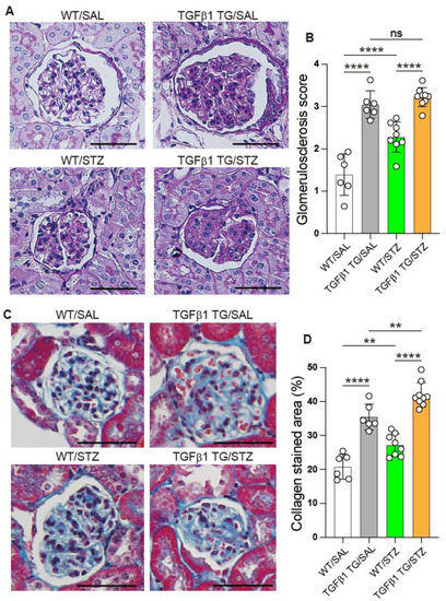 Renal tissue specimens were cut and stained with periodic acid–Schiff and Masson’s trichrome to evaluate the fibrosis grade of each group. The tissue slides were used for the scoring of glomerulosclerosis. The glomerulosclerosis score was not significantly increased in the diabetic TGFβ1 TG mice compared to the non-diabetic TGFβ1 TG mice but significantly increased in the diabetic TGFβ1 TG mice compared to the diabetic WT mice. The non-diabetic TGFβ1 TG mice and diabetic WT mice showed significantly higher glomerulosclerosis scores than the non-diabetic WT mice (Figure 7A,B). The glomerular area stained with collagen (trichrome) was significantly increased in the diabetic TGFβ1 TG mice compared to the diabetic WT mice and non-diabetic TGFβ1 TG mice. The area stained with collagen was also significantly enhanced in the diabetic WT mice compared to the non-diabetic WT mice (Figure 7C,D).