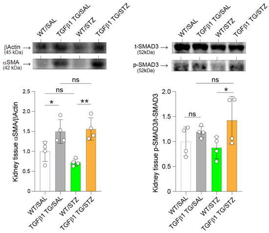 The protein expression of α-SMA and activation of SMAD3 were assessed by western blotting. The protein expression of αSMA was significantly increased in the diabetic TGFβ1 TG mice compared to the diabetic WT mice. The non-diabetic TGFβ1 TG mice also showed a significantly increased level of αSMA in the renal tissues compared to their non-diabetic WT counterparts. The phosphorylation of SMAD3 was significantly increased in the diabetic TGFβ1 TG mice compared to the diabetic WT mice. No significant difference was observed between the diabetic and non-diabetic WT mice (Figure 8).