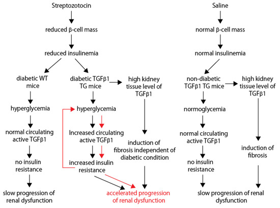 A critical question that needs to be addressed is: to what extent can renal dysfunction be attributed to the direct effect of hyperglycemia on the diabetic TGFβ1 TG mice due to insulin resistance (and the related glucotoxicity) compared to the increased circulating active TGFβ1 levels? Based on the results of our present study, we speculate that the following sequential events may explain the rapidly progressive renal dysfunction in diabetic TGFβ1 TG mice: a reduction in the islet β-cell mass by STZ induces a vicious cycle, where hyperglycemia increases the circulating levels of active TGFβ1, which further worsens hyperglycemia by inducing insulin resistance (Figure 9). Consequently, the high level of TGFβ1 in the kidneys and the high circulating level of active TGFβ1 lead to accelerated renal dysfunction in diabetic TGFβ1 TG mice. Non-diabetic TGFβ1 TG mice and diabetic WT mice show no high levels of circulating active TGFβ1 and, thus, the course of renal dysfunction is slow.