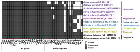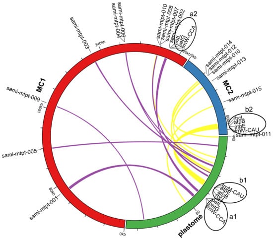 - Skippington, E.; Barkman, T.J.; Rice, D.W.; Palmer, J.D. Miniaturized mitogenome of the parasitic plant Viscum scurruloideum is extremely divergent and dynamic and has lost all nad genes. Proc. Natl. Acad. Sci. USA 2015, 112, E3515–E3524. [Google Scholar] [CrossRef]