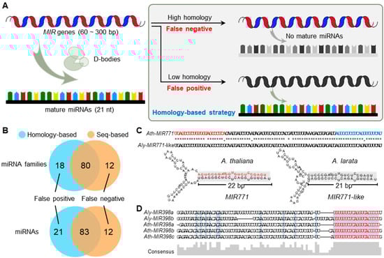 Comparison of homology-based and seq-based strategies for cataloging SS-miRNAs. (A) A schematic diagram showing a false negative and a false positive of SS-miRNAs caused by the homology-based strategy. (B) A comparison of the results of SS-miRNAs and SS-miRNA families in A. thaliana identified using the two strategies. (C) Sequence alignments and secondary structures, showing a false negative SS-miRNA family (MIR771) mistakenly identified by the homology-based approach. Mature and star miR771 are highlighted in red and blue letters, respectively. The same nucleotides are marked in *. (D) Sequence alignments of the MIR398 family in A. thaliana and A. lyrate, showing a false positive SS-miRNA family in A. thaliana.