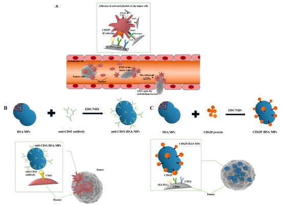 In this study, we explored two drug delivery strategies that take advantage of the adhesion ability of platelets to CTCs (Figure 1A). (1) CD41, also known as GpIIb, is a cell-surface protein expressed at high levels on platelets. The anti-CD41 antibody-modified HSA-MPs are designed to trail tumor cells by hitchhiking on the platelet. (Figure 1B). (2) The mechanism of platelet aggregation around tumor cells includes the binding of biomolecules such as CD62P, which belongs to the selectin family. CD62P translocates to the platelet surface when platelets are activated, mediating the adhesion of platelets to the endothelial cells, leukocytes, and tumor cells [,]. We revealed the expression of common ligands for CD62P, including CD44, SELPLG, and CD24 [], in pan-cancer analysis using TCGA and CCLE datasets. The CD62P enabled the HSA-MPs to specifically bind to the upregulated receptors on the surface of tumor cells. The platelet-mimicking particles with platelet-specific protein modifications, CD62P-HSA-MPs, were constructed to directly target tumor cells specifically (Figure 1C).