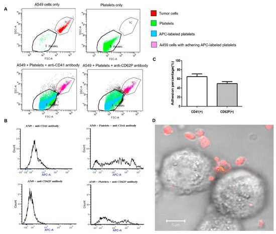 Under normal hematological circumstances, the platelets activated in response to shear stress []. The high shear rates were able to induce platelet activation []. After trypsinization, A549 cells were incubated in PRP (tumor/platelet = 1/250) for 30 min under 3000 s−1 shear rate in a high-performance rheometer (Physica MCR 301, Anton Paar, Graz, Austria) at 37 °C. The platelets were marked with APC anti-CD41 antibody, Alexa 647 anti-CD62P antibody, or Alexa 488 anti-CD62P antibody. The percentage of cells with the adhesion of particles and the mean fluorescence intensity (MFI) of A549 cells were quantified by flow cytometry in the APC channel (BD FACS Canto II, Franklin Lakes, NJ, USA). The samples were also observed under a fluorescence microscope (CLSM ZeissLSM 510 meta, Zeiss MicroImaging GmbH, Jena, Germany).