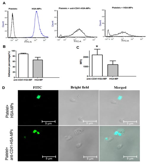 Adhesion of anti-CD41-HSA-MPs to platelets (A). Flow cytometry histograms of the fluorescence intensity in the platelet or FITC-HSA-MP populations (black line: platelets only; blue line: FITC-HSA-MPs only), and in the populations of platelets incubated with FITC-HSA-MPs or platelets incubated with anti-CD41-FITC-HSA-MPs, respectively. (B). Percentage of platelets with adhered FITC-HSA-MPs or anti-CD41-FITC-HSA-MPs. (C). Mean fluorescent intensity (MFI) values of the platelet population in the FITC channel. * p < 0.05. (D). Representative confocal laser scanning microscopy images of HSA-MPs and anti-CD41-HSA-MPs with platelets.