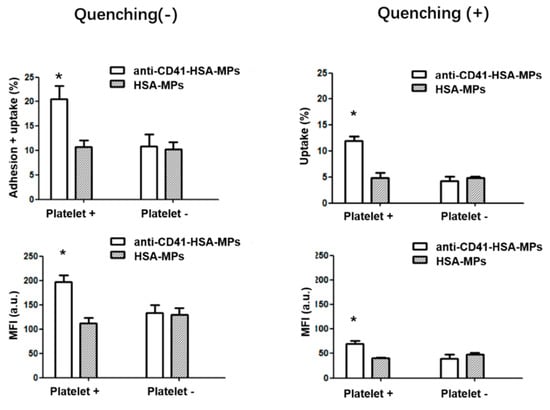 A549 cells were pre-incubated with arachidonic acid-activated platelets for 30 min and then FITC-labeled anti-CD41-HSA-MPs or HSA-MPs were added and the samples were incubated for 24 h. The fluorescence intensity analyzed by the flow cytometer (Figure 4) showed a significantly higher cellular uptake of anti-CD41-HSA-MPs than that of HSA-MPs in the presence of platelets. In the absence of the platelets, the cellular uptake of anti-CD41-HSA-MPs was reduced and had no difference with HSA-MPs. Measurement of fluorescence using flow cytometry allowed us to determine the A549 cells with internalized or adherent particles. The fully internalized particles were then retained by quenching the fluorescence of the remaining extracellular particles using Trypan blue. The cellular uptake percentage and MFI value decreased in all groups after quenching. However, the cellular uptake of anti-CD41-HSA-MPs in the presence of platelets was still significantly higher than that of HSA-MPs, which means that the platelet-adhering anti-CD41-HSA-MPs could be internalized more efficiently by A549 cells than the HSA-MPs in the presence of activated platelets.