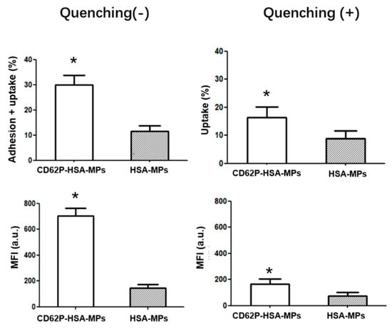 A549 cells were incubated with FITC-labeled CD62P-HSA-MPs or HSA-MPs for 24 h, and the resulting fluorescence per cell was measured by flow cytometry after quenching or not. The HSA-MPs served as a control. The cellular uptake percentage and MFI in the CD62P-HSA-MP group were both higher than those in the HSA-MP group with and without quenching (Figure 5). This means that CD62P-HSA-MPs could be internalized more efficiently than the HSA-MPs by the A549 cells.