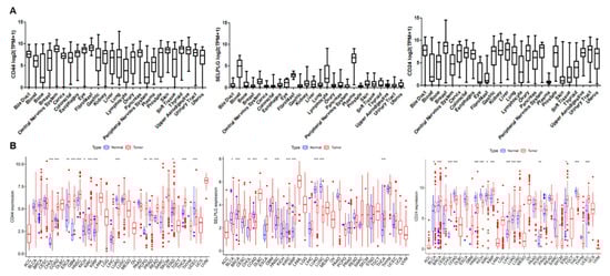CD62P binds to several common ligands, including CD44, SELPLG, and CD24. The Cancer Cell Line Encyclopedia (CCLE) project (accessed on 6 July 2022, https://www.broadinstitute.org/ccle) was used to validate the expression profiles of CD44 and SELPLG in 1091 cell lines. The Cancer Genome Atlas (TCGA) database (accessed on 7 July 2022, https://portal.gdc.cancer.gov/) was used to validate the CD44 and SELPLG expression in 33 cancers. Different gene expression analysis was performed using the limma package in R studio software to determine whether CD44 or SELPLG expression varied between tumors and normal tissues.
