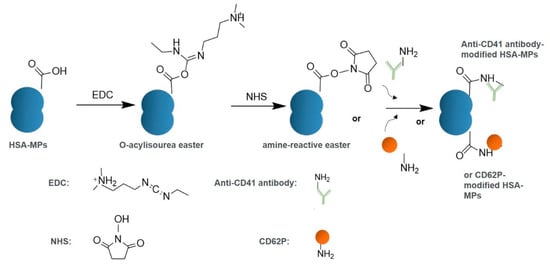 Anti-CD41 antibody was coupled to HSA-MPs through 1-ethyl-3-(-3-dimethyl aminopropyl) carbodiimide hydrochloride (EDC) and N-hydroxysuccinimide (NHS) EDC/NHS chemistry. First, HSA-MPs were repeatedly washed with activation buffer (50 mM MES buffer, PH 6). Then, 4.8 mM EDC and 48 mM NHS were simultaneously added to a 0.1% HSA-MP solution. This mixture was incubated at room temperature for 30 min. Afterwards, the anti-CD41 antibody was added to reach a 10 µg/mL concentration. We then mixed the solution well and then allowed the reaction to proceed for 2.5 h. Quenching was performed by adding glycine to a final 4 mg/mL concentration. Finally, the solution was washed with blocking buffer (50 mM Tris pH 8 and 0.5% HSA), and the final anti-CD41-HSA-MPs were stored in the blocking buffer. The same method was used during the preparation of CD62P-HSA-MPs (Figure 7).
